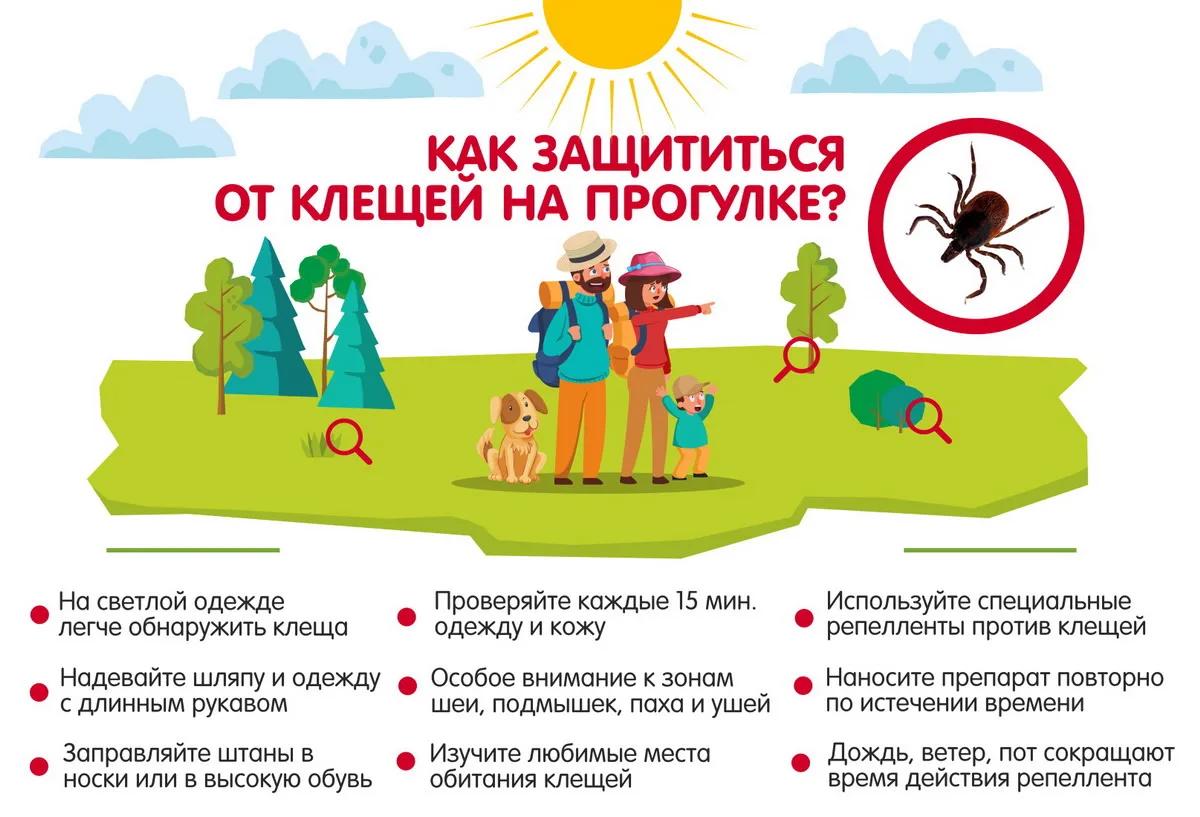 Необходимо обратиться за медицинской помощью, врач назначит профилактическое лечение. Если возможности обратиться за медицинской помощью нет, то клеща нужно вытащить как можно скорее, но при этом необходимо соблюдать осторожность. Можно вытаскивать его пинцетом или ниткой, обвитой вокруг головы клеща, выкручивающими движениями. В течение 14 дней после присасывания клеща необходимо проводить термометрию два раза в день. Как защитить детей от клещей В этой статье мы расскажем о правилах поведения на прогулках с детьми по территориям, опасным в отношении клещей. Клещи обитают в траве, невысоких кустарниках и никогда – на деревьях. Клещ прикрепляется к одежде в тот момент, когда человек оказывается рядом, после чего начинает двигаться по одежде вверх в поисках «укромного местечка» на коже под одеждой, где и присасывается. Если вы решили погулять в лесу или в парке с малышом, который еще не может уверенно самостоятельно ходить или стоять, необходимо переносить его на руках или перевозить в колясках. В этом случае мы можем быть уверены, что ребенок не упадет и не сядет на траву – место обитания клещей. При прогулке необходимо двигаться по центру дорожек, стараясь не задевать траву и кусты, растущие по краям. За безопасность детей младшего возраста, находящихся на опасной в отношении клещей территории, отвечают сопровождающие их взрослые. Если во время прогулки приходится передвигаться с коляской, задевая траву и кустарники, растущие по краям дорожки, нужно заранее обработать нижние детали коляски специальным акарицидным аэрозольным средством для защиты от клещей, чтобы клещи не смогли заползти по колесам и другим деталям коляски к ребенку. Детям старшего возраста необходимо объяснять принципы поведения на опасной в отношении клещей территории. Одежду детей акарицидными аэрозольными средствами обрабатывают только взрослые в соответствии с правилами, изложенными на этикетке к средству.